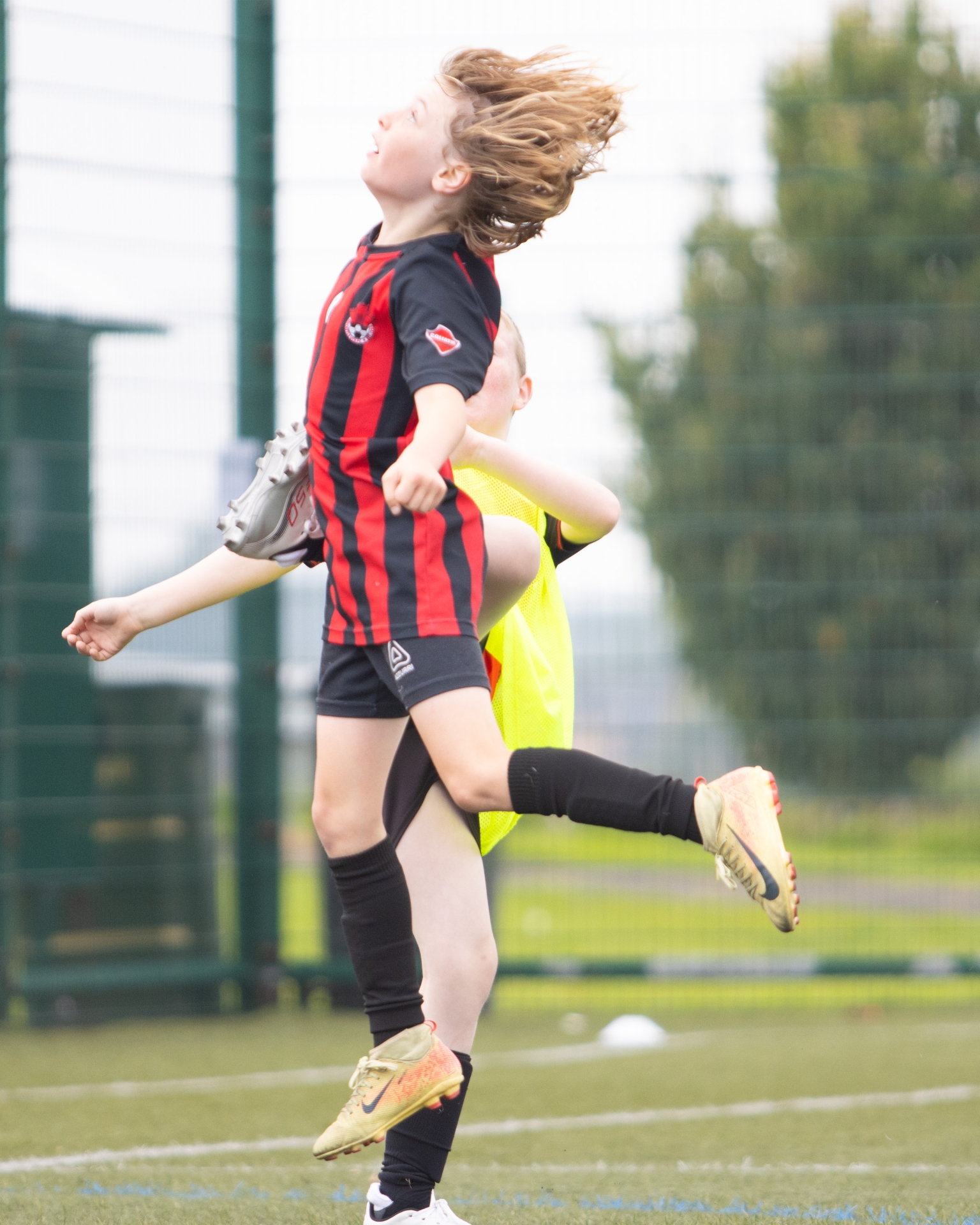 A young Redcastle United FC player reaches new heights as he leaps for a header during Thursday's Foyle Cup Under 10_s group game against Dergview FC at Leafair, Derry. (Photos Roisin McFadden)