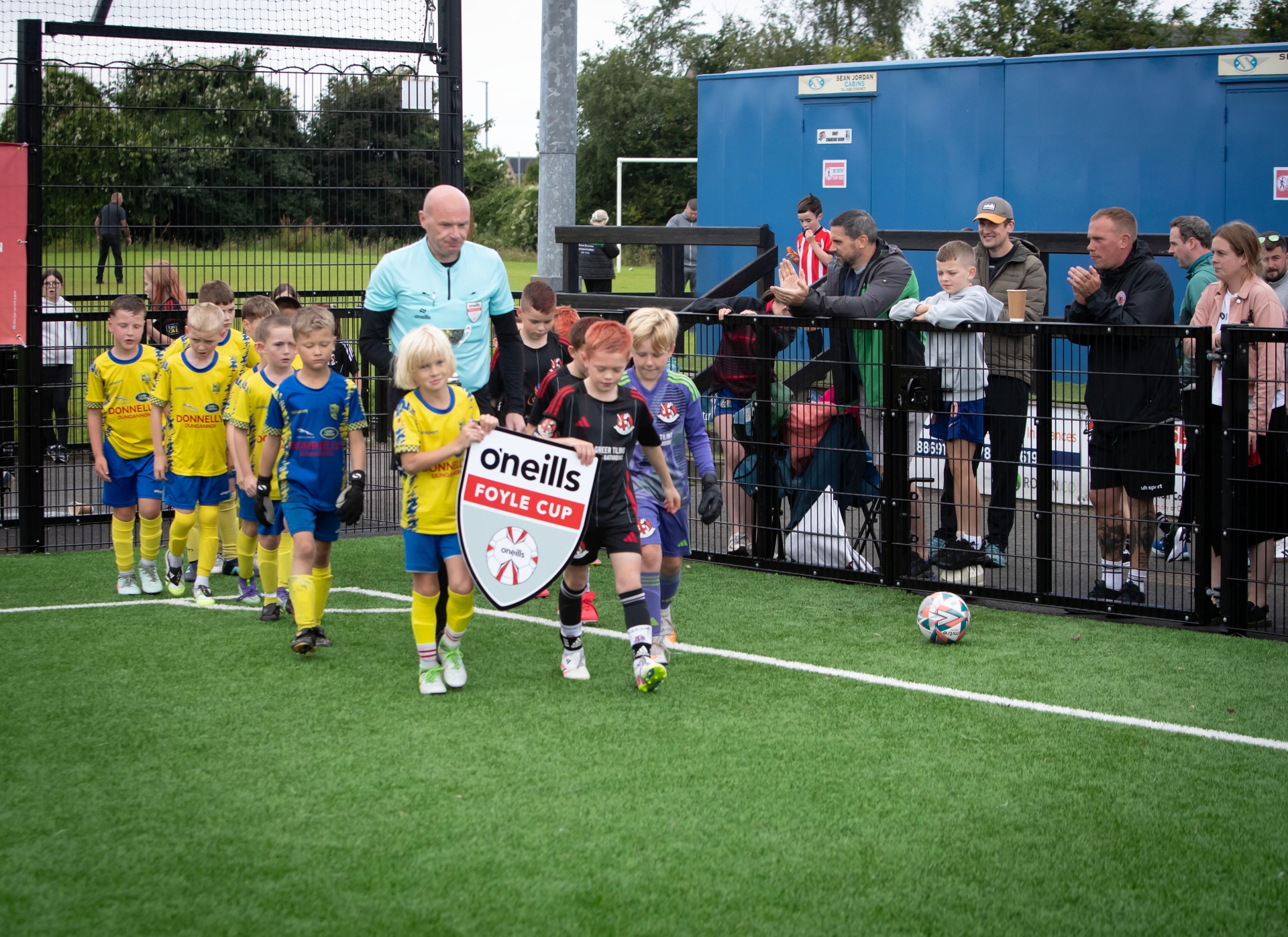 Referee Gareth Johnstone leads out Dungannon and Crusaders in the under-8 Foyle Cup Final at Lisneal College on Friday morning. Dungannon won 1-0. (Photos: Jim McCafferty Photography)