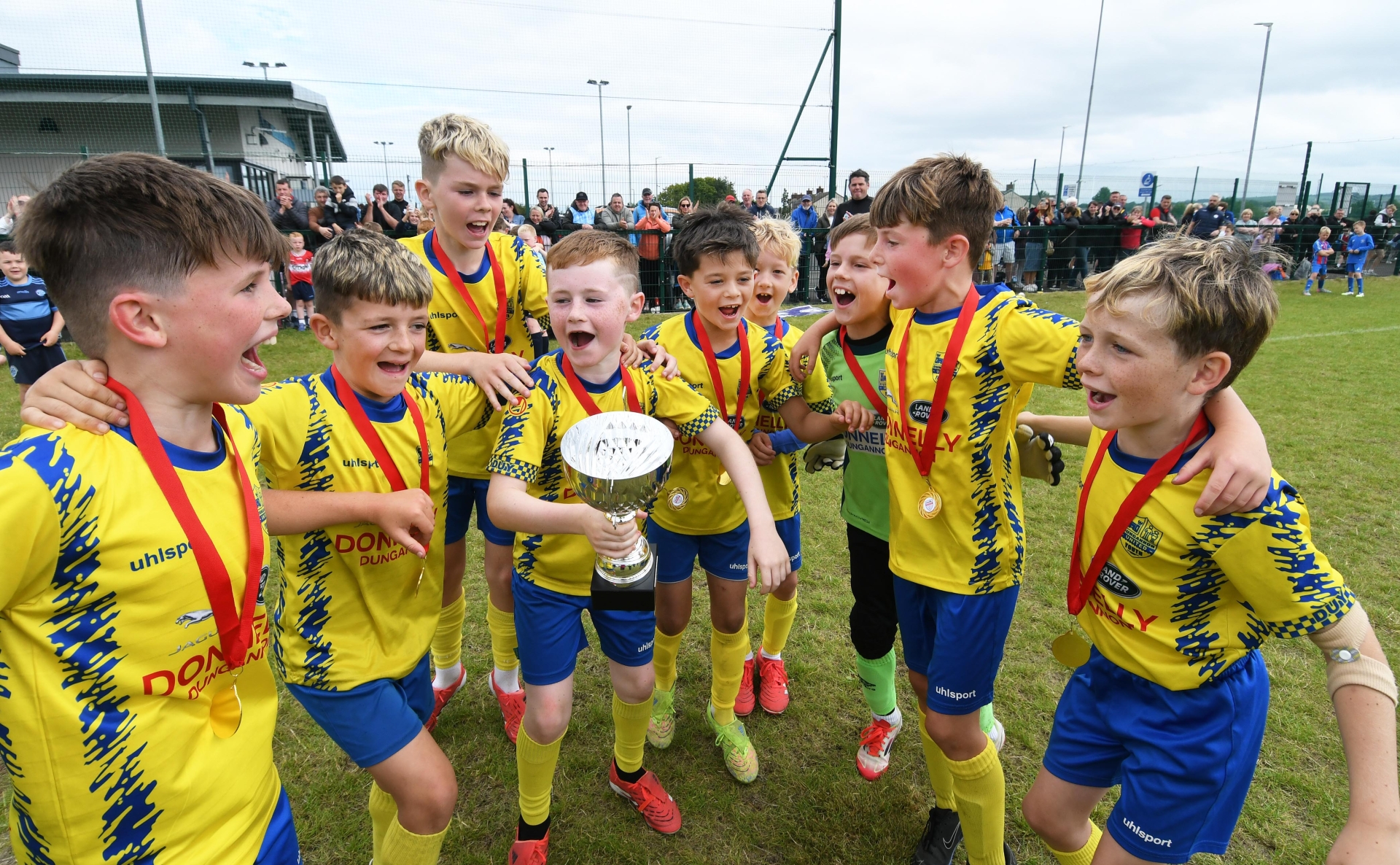 The Dungannon United Youth team celebrate after lifting the O'Neills Foyle Cup Under-9's Cup at the Waterside Shared Village.