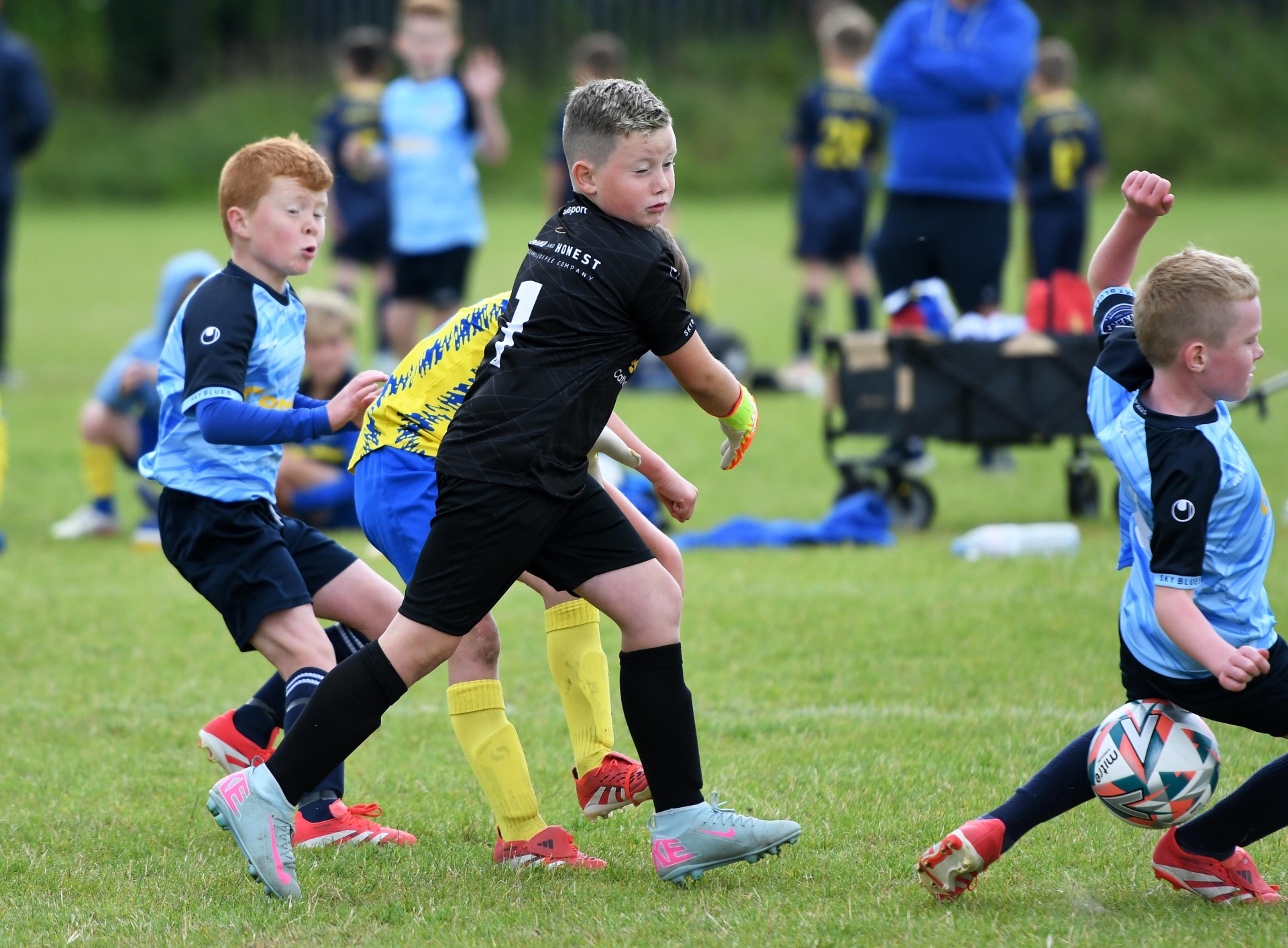 Magherafelt Sky Blues Colts goalkeeper was happy to see the ball blocked on the line.
