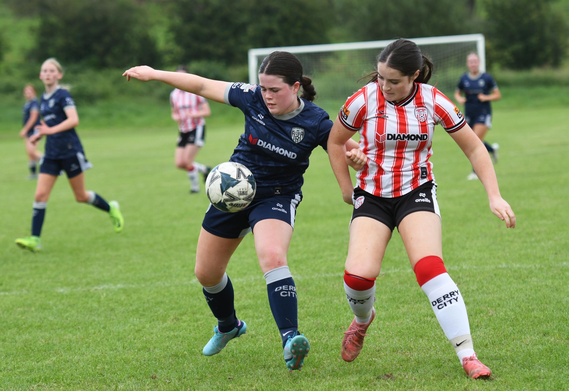 Sarah Colhoun, Derry City Colts, and Ashling Mahon, Derry City under-17's tussle for the ball at Claudy.