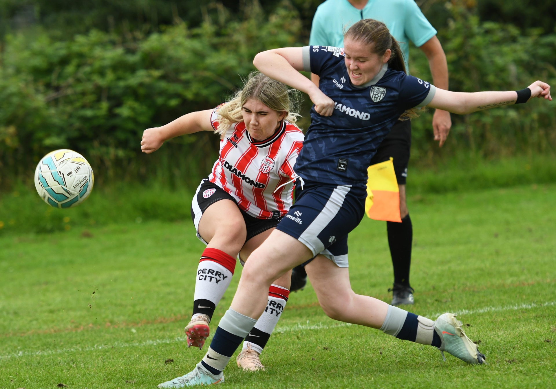 Kaylee Mitchell Derry City under-17's gets her cross away despite the close attentions of Derry City Colts player Mia Monaghan during the O'Neills Foyle Cup Girls Under-17's Cup final at Claudy.