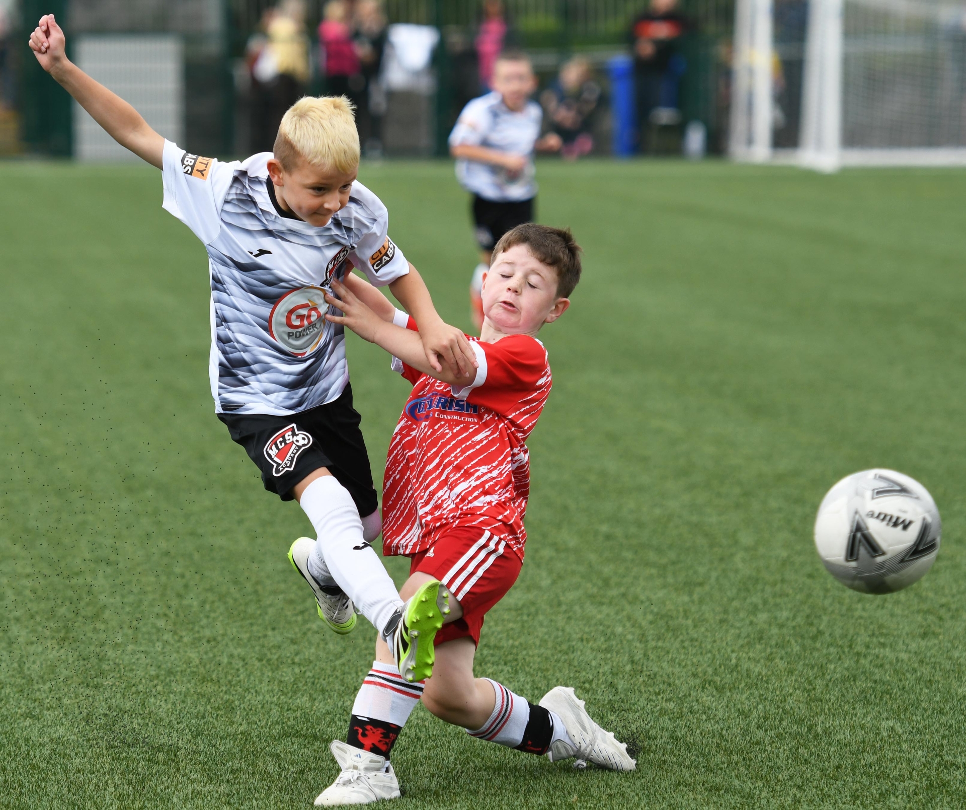 Maiden City under-8's forward Kian White gets his shot away despite the best efforts of Cappry Rovers defender Matthew Breen.