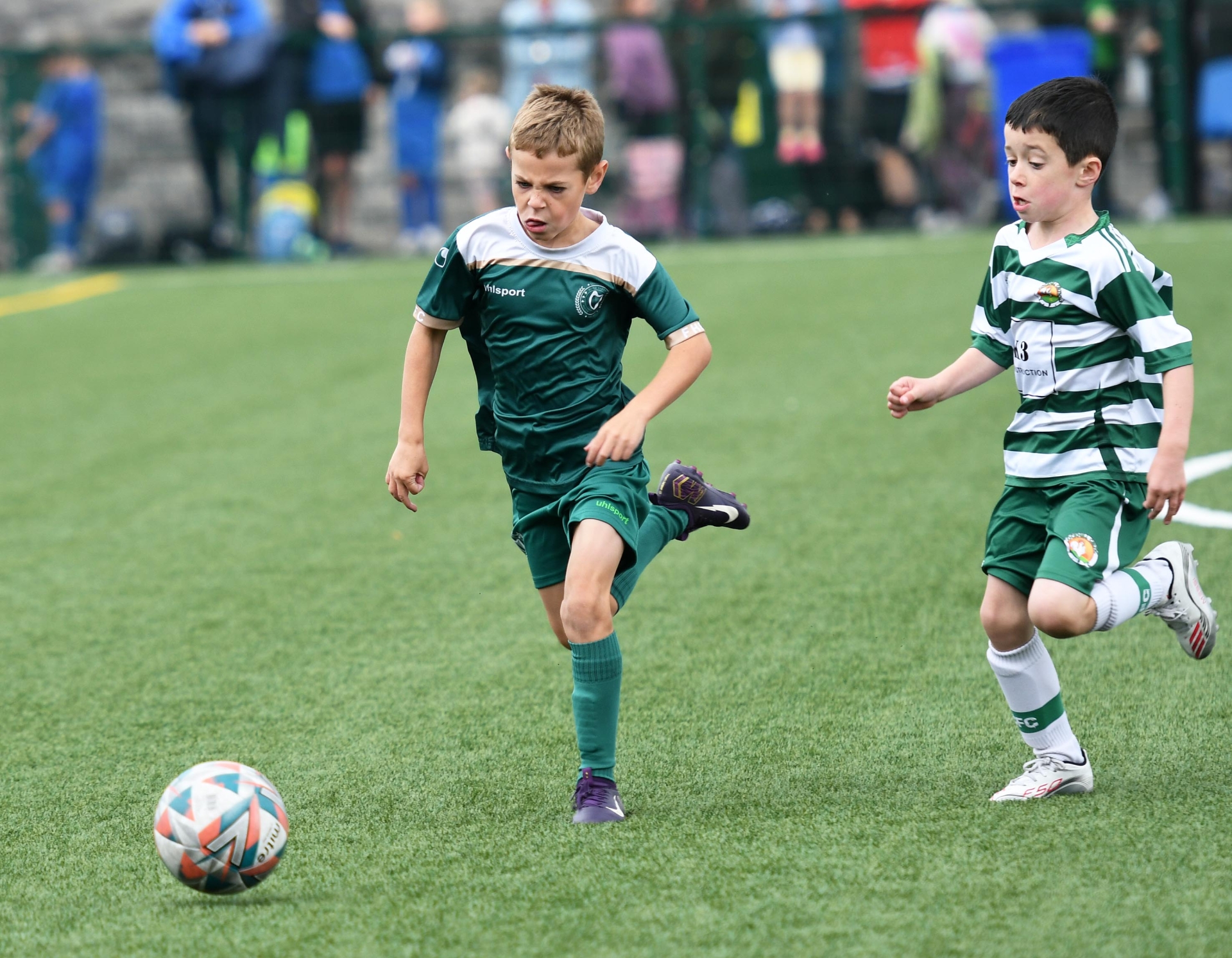 A race for the ball during the under-8's match between Foyle Harps and Cockhill Celtic at the Waterside Shared Village. (Photos: Keith Moore)