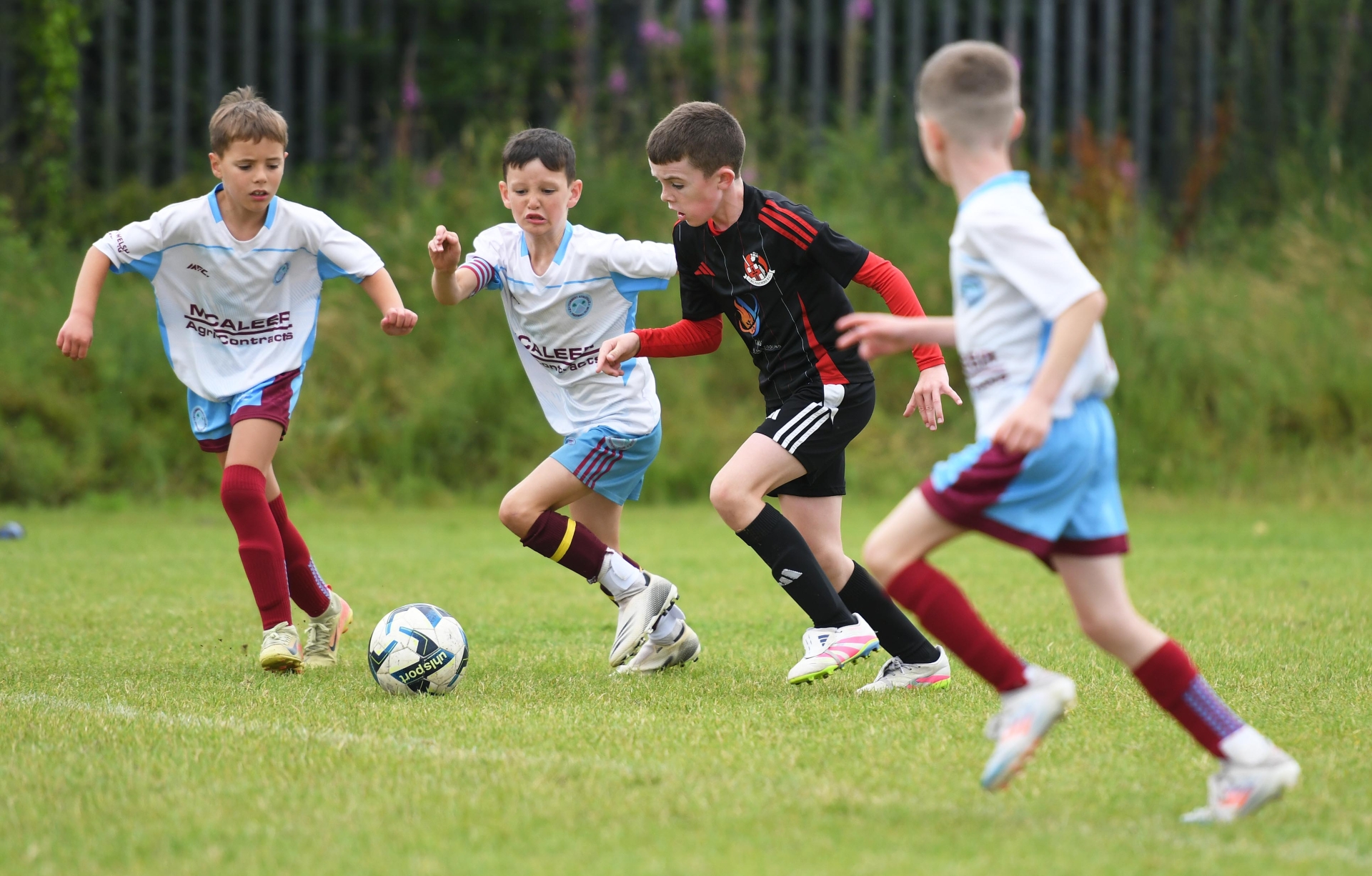 A Crusaders player powers through midfield during their under-9's match against Tummery Colts at the Waterside Shared Village.