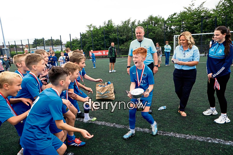 Ballinamallard players celebrate winning the Foyle Cup U11 final against Magherfelt Sky Blues.