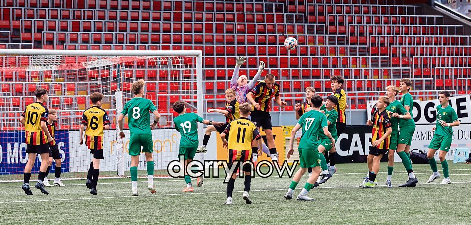 Patrick Thistle goal under attack from Donegal players in the Foyle Cup U14 final at the Ryan McBride Brandywell Stadium.
