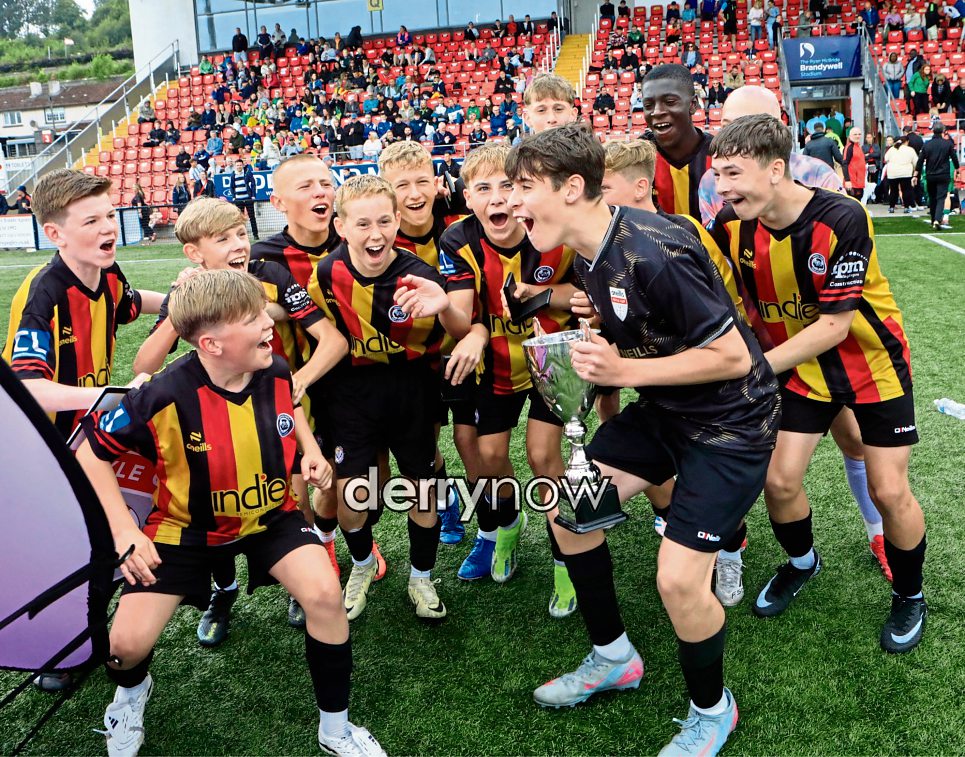 Patrick Thistle players celebrating winning the Foyle Cup U14 Final beating Donegal at the Ryan McBride Brandywell Stadium.