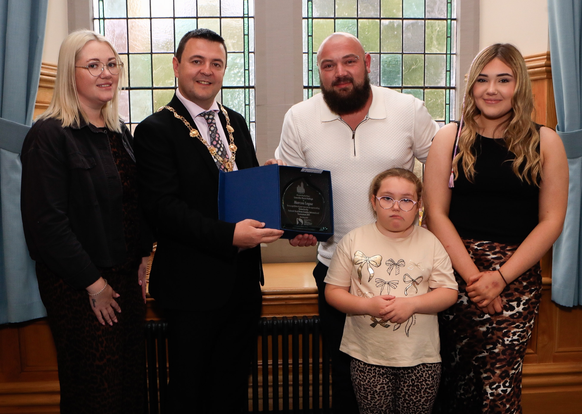 Mayor Ruairí McHugh making a presentation to Marcus Logue. Included are Nicole (wife), children Lacy and Afiya.