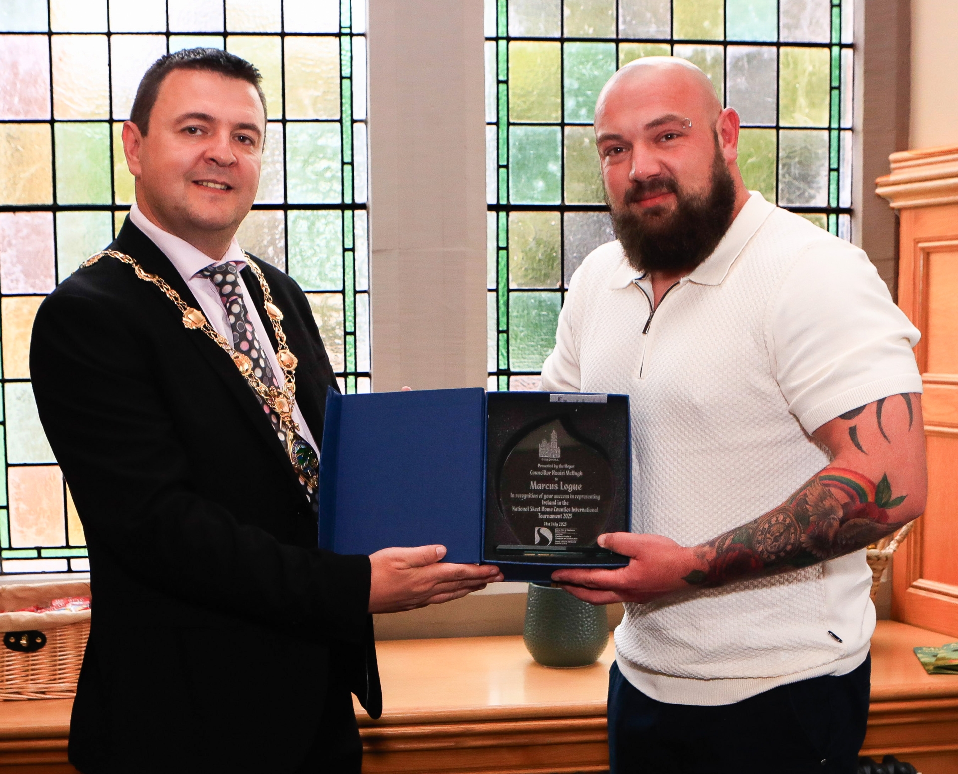Mayor Ruairí McHugh making a presentation to Marcus Logue in recognition of his recent success.