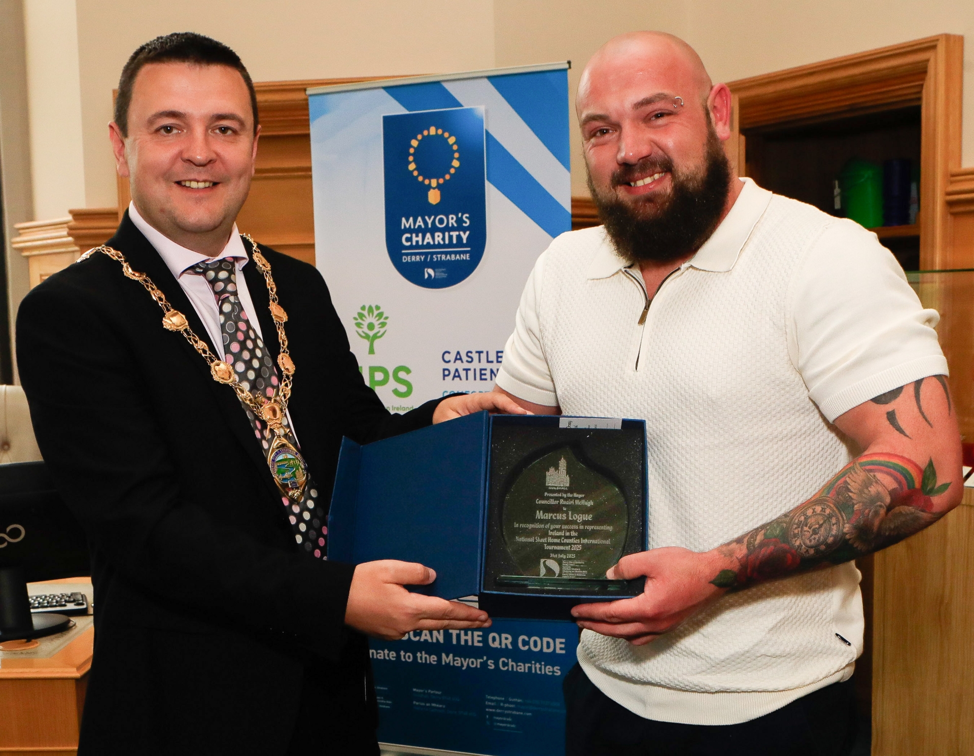 Mayor Ruairí McHugh making a presentation to Marcus Logue in recognition of his success in representing Ireland in the National Skeet Home Countries International Tournament 2025 at a civic reception in the Mayor's Parlour. (Photos - Tom Heaney, nwpresspics)