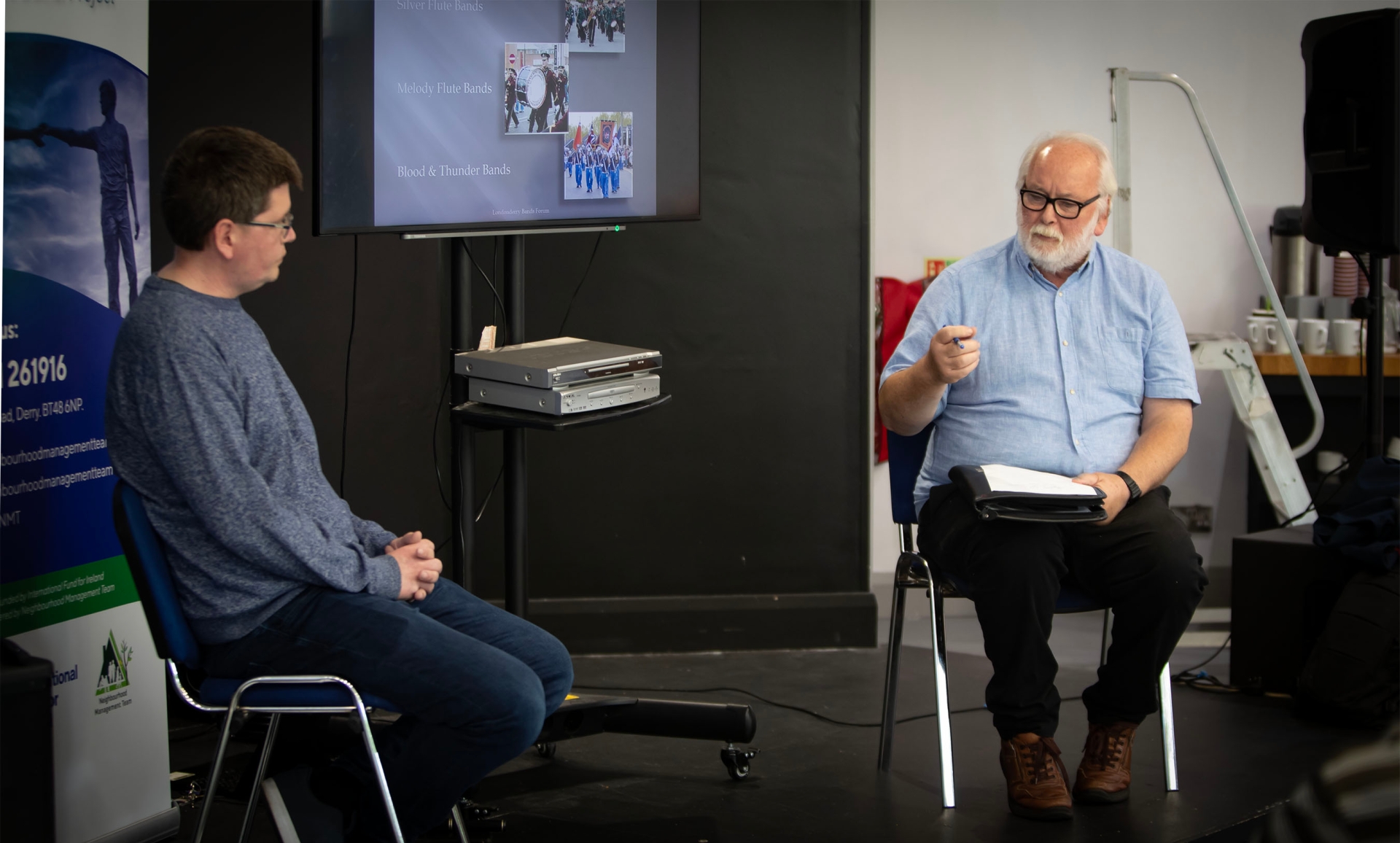 Former Derry Journal editor and chair of the 'Did Ye Hear About' Conversation Series, Pat McArt making a point to Londonderry Bands Forum's Edward Lynch on Monday.