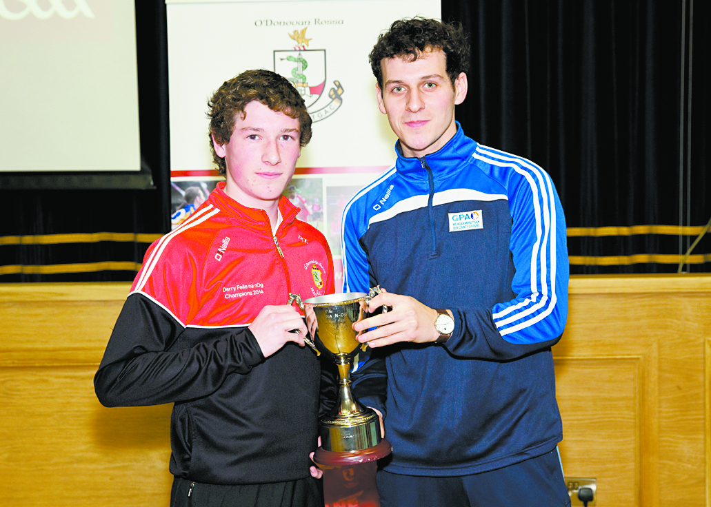 U14 Feile Captain Peter Tohill receiving the Derry Feile Peil na nOg trophy from Jamie Clarke