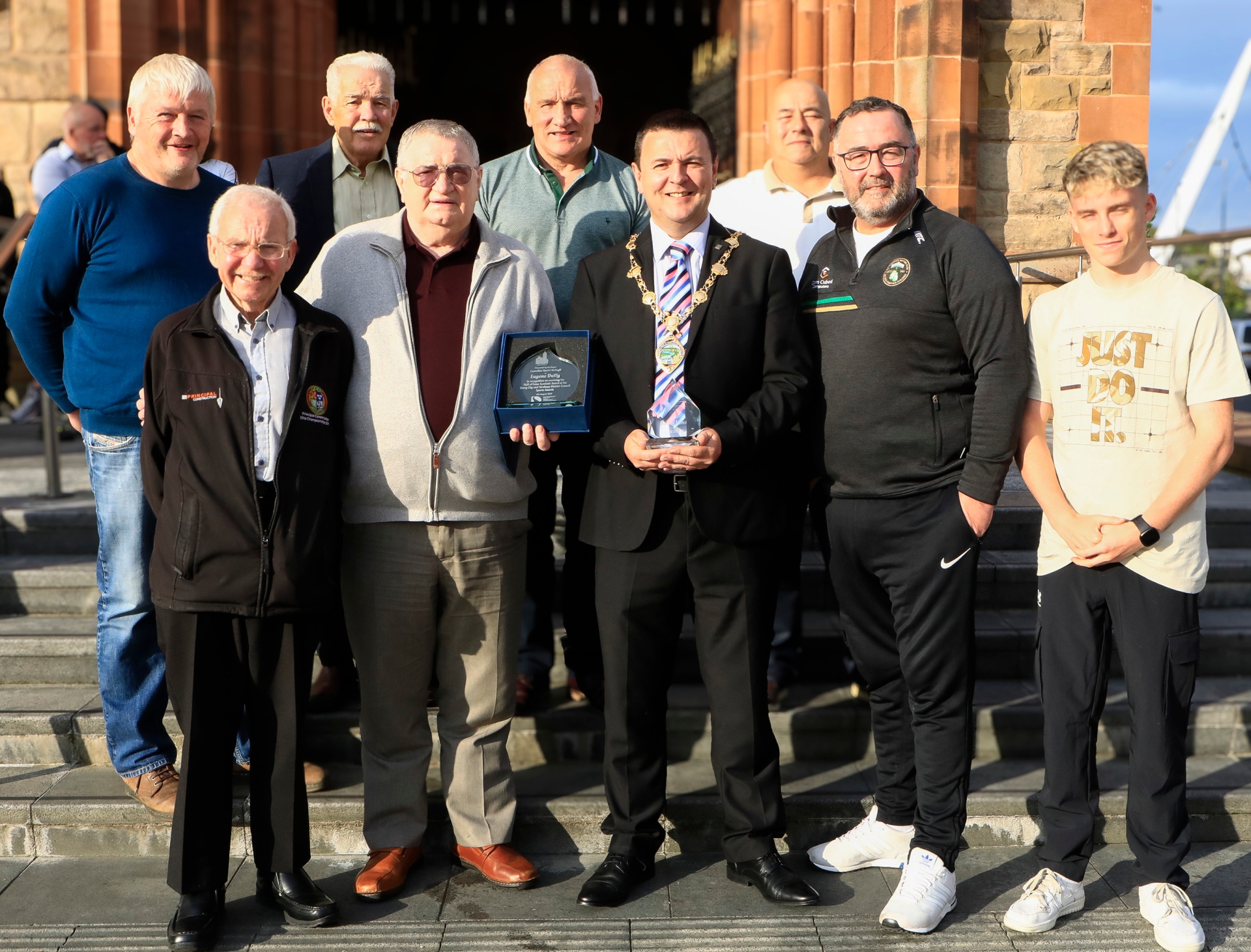 Mayor Ruairí McHugh makes a presentation to IABA’s vice-president Eugene Duffy to mark his lifetime of service to boxing and to his local community. Included are members of the County Donegal Boxing Board.