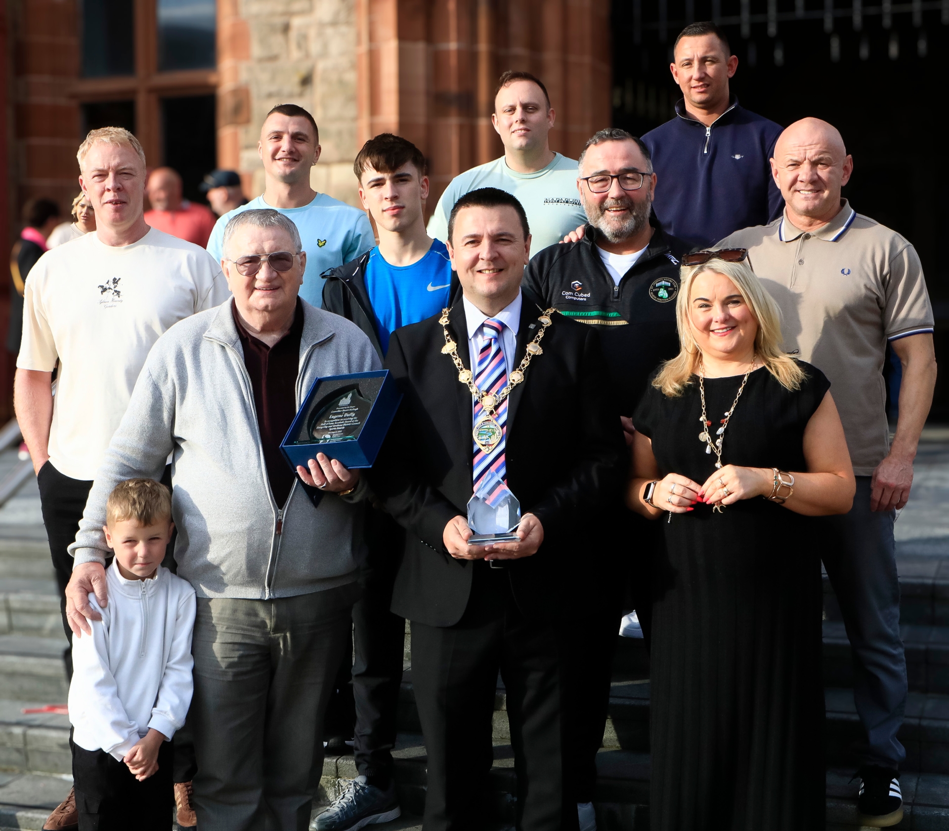 Mayor Ruairí McHugh makes a presentation to IABA’s vice-president Eugene Duffy to mark his lifetime of service to boxing and to his local community by Derry & Strabane District Council at a civic reception held in the Guildhall on Wednesday night. Included are Colr. Sandra Duffy and members of St. Joseph's ABC. (Photos - Tom Heaney, nwpresspics)