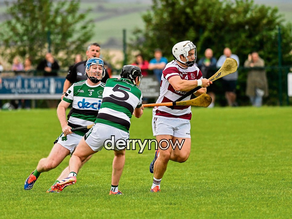 Na Magha’s Diarmuid Shiels and Oisin Glass challenge Slaughtneil’s Finn McEldowney.