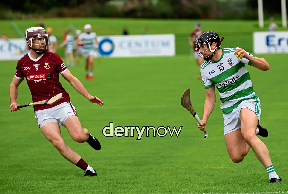 Swatragh's Fintain McGurk holds off Banagher's Darragh McCloskey.