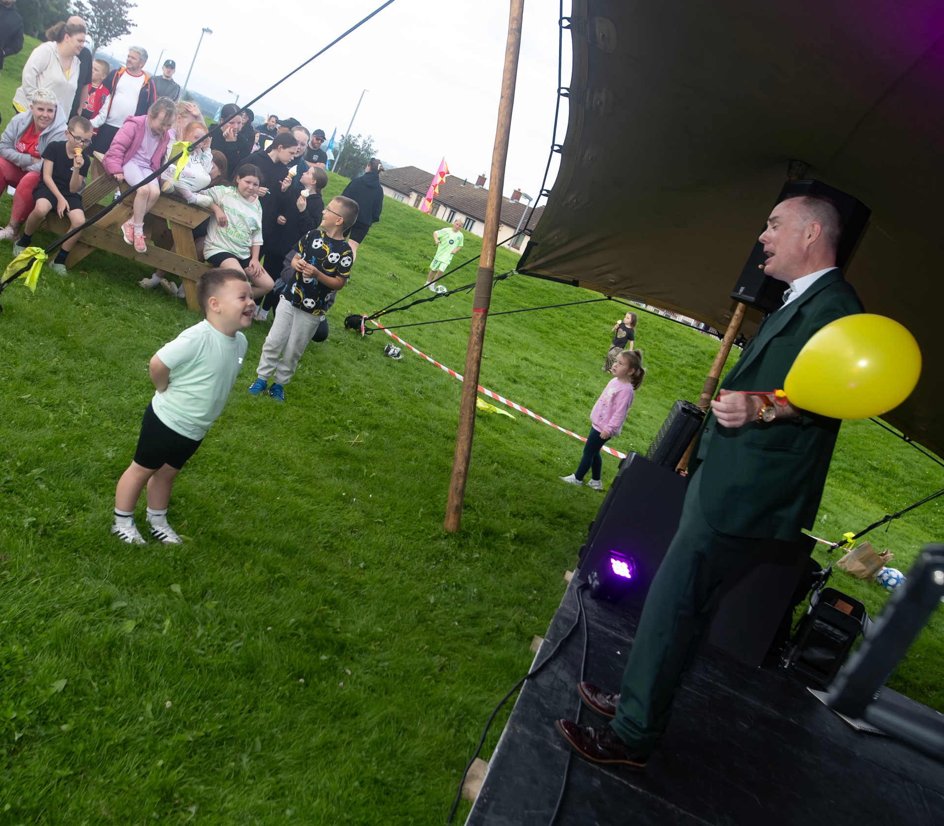Magician Caolan McBride gets a new No. 1 Fan in Creggan on Monday evening.