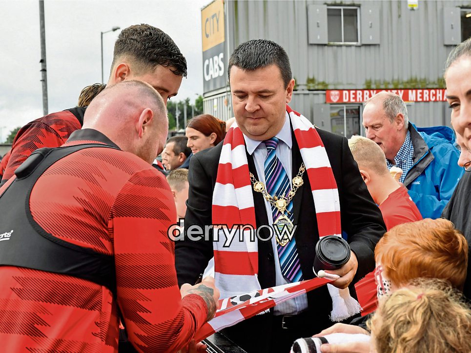Derry players Brian Maher and Mark Connolly sign autographs for Mayor Ruairí McHugh. (Photos – nwpresspics)