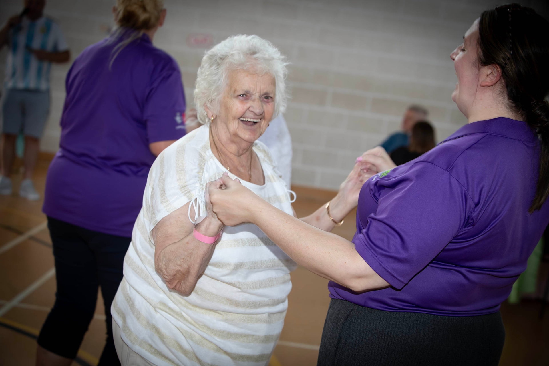 Bernie Gillespie (Hillcrest Social Group) and Rachel Doherty (DEEDS volunteer), in full flow on the dance floor.