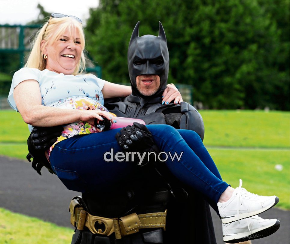 Glen Feile staff member Bronagh gets a lift in the air by Super Hero "Batman" at the Glen Play Park. (Photos - Deirdre Heaney, nwpresspics)