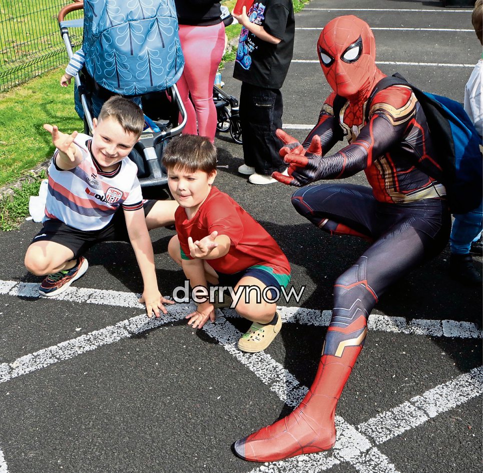 Ben and Jude meet Super Hero "Spiderman" at the Glen Feile held in the Glen Play Park. (Photos - Deirdre Heaney, nwpresspics)