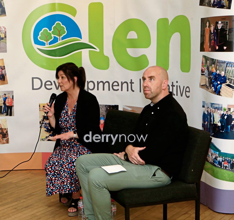 Margaret Craig, Development Trust NI, speaking at the "Magee Expansion" Public meeting held in the Glen Community Centre. Included is , Brian O'Neill, co-chair NW Community Wealth Building Partnership. (Photos - Tom Heaney, nwpresspics)