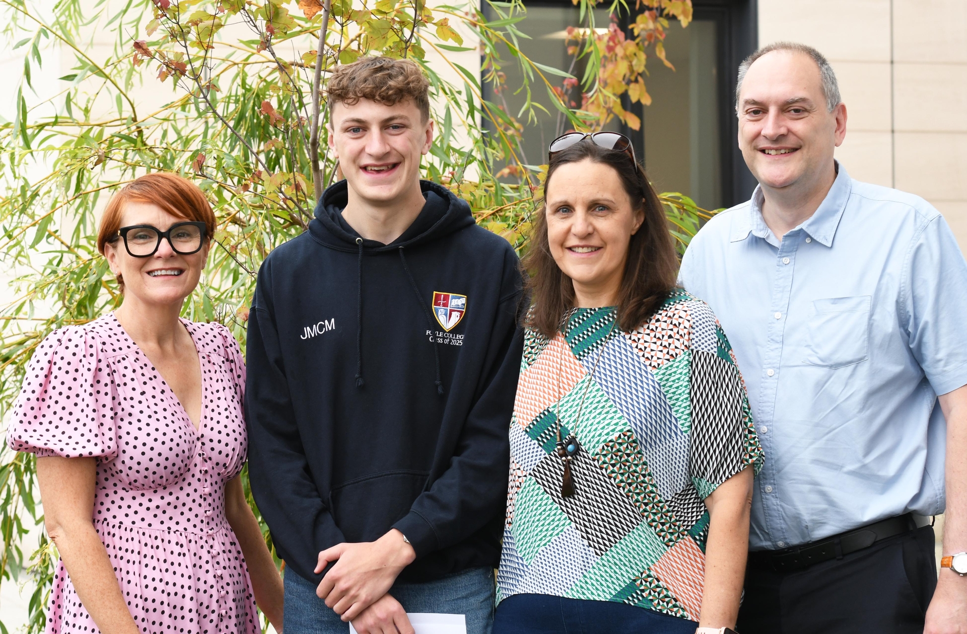 Deirdre McLaughlin, Principal, with James McMorris and his proud parents Lorraine and Douglas.