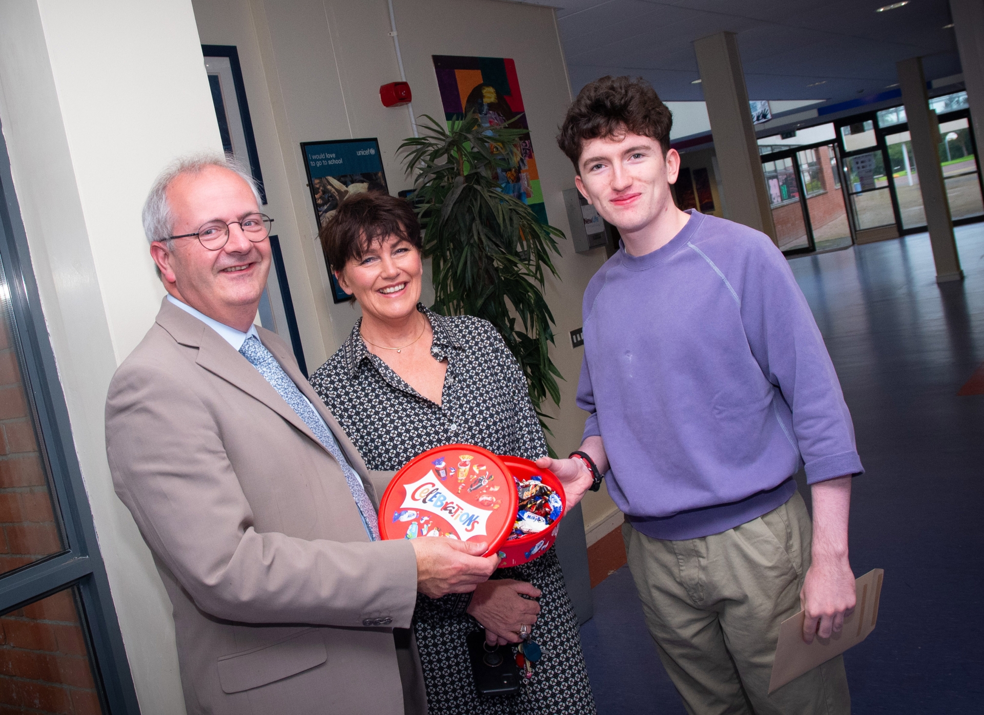 Oakgrove Integrated College Principal John Harkin with Niall Downey and his mum Cathy.
