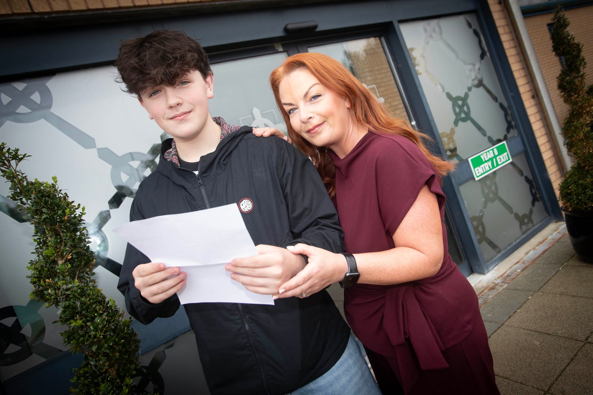 St. Joseph's Boys School A Level student Bradan McSwiney pictured with his mum Tina on receiving his results at the school on Thursday morning. (Photos: Jim McCafferty Photography)