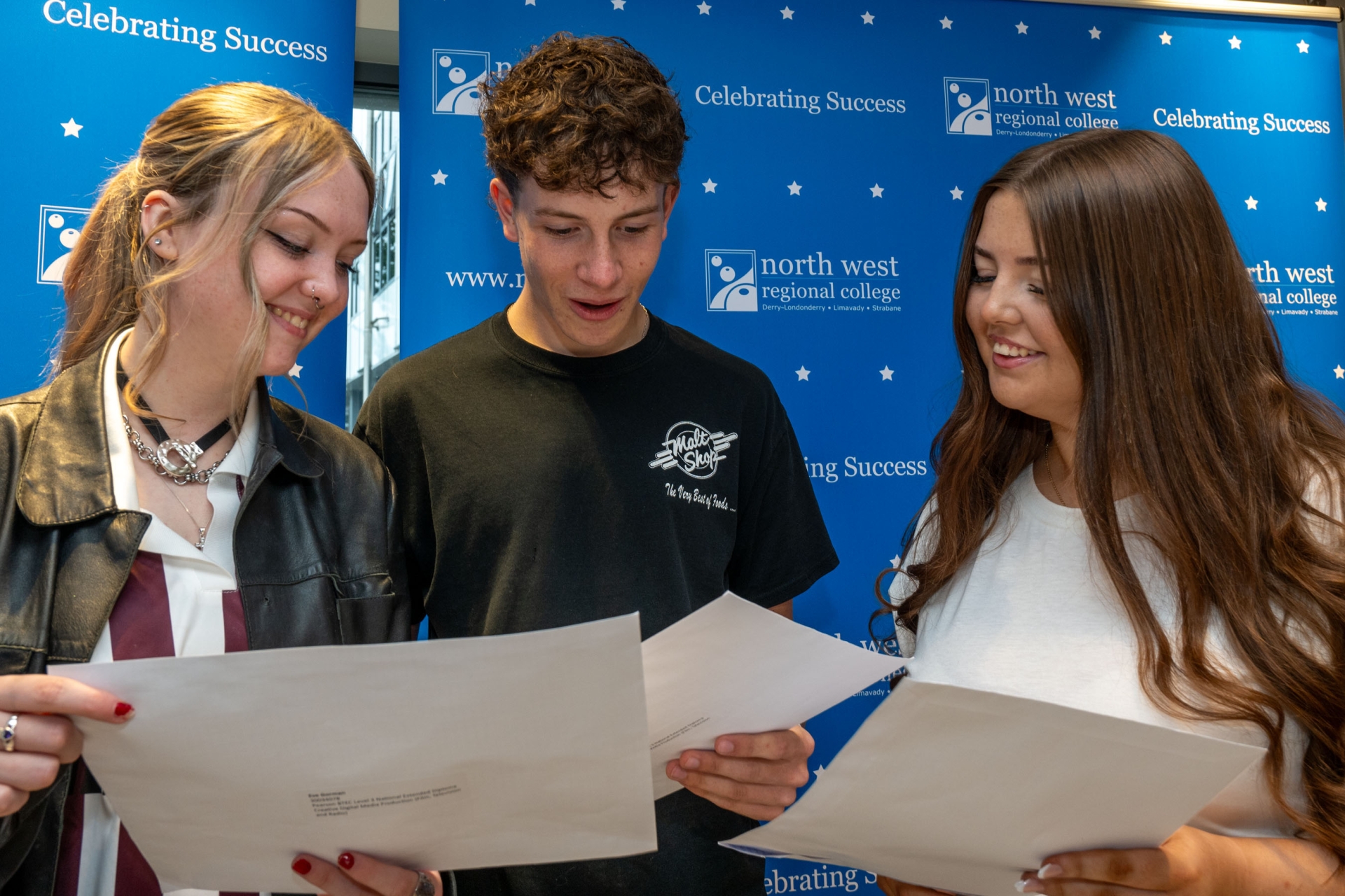 NWRC students Eve Gorman, Harry Lavery and Ellie Kelly Carton celebrate their BTEC Level 3 Extended Diploma examination results. Eve is continuing her studies with a HND at NWRC, Harry is going on to a degree in Film and Ellie is progressing to Ulster University.
