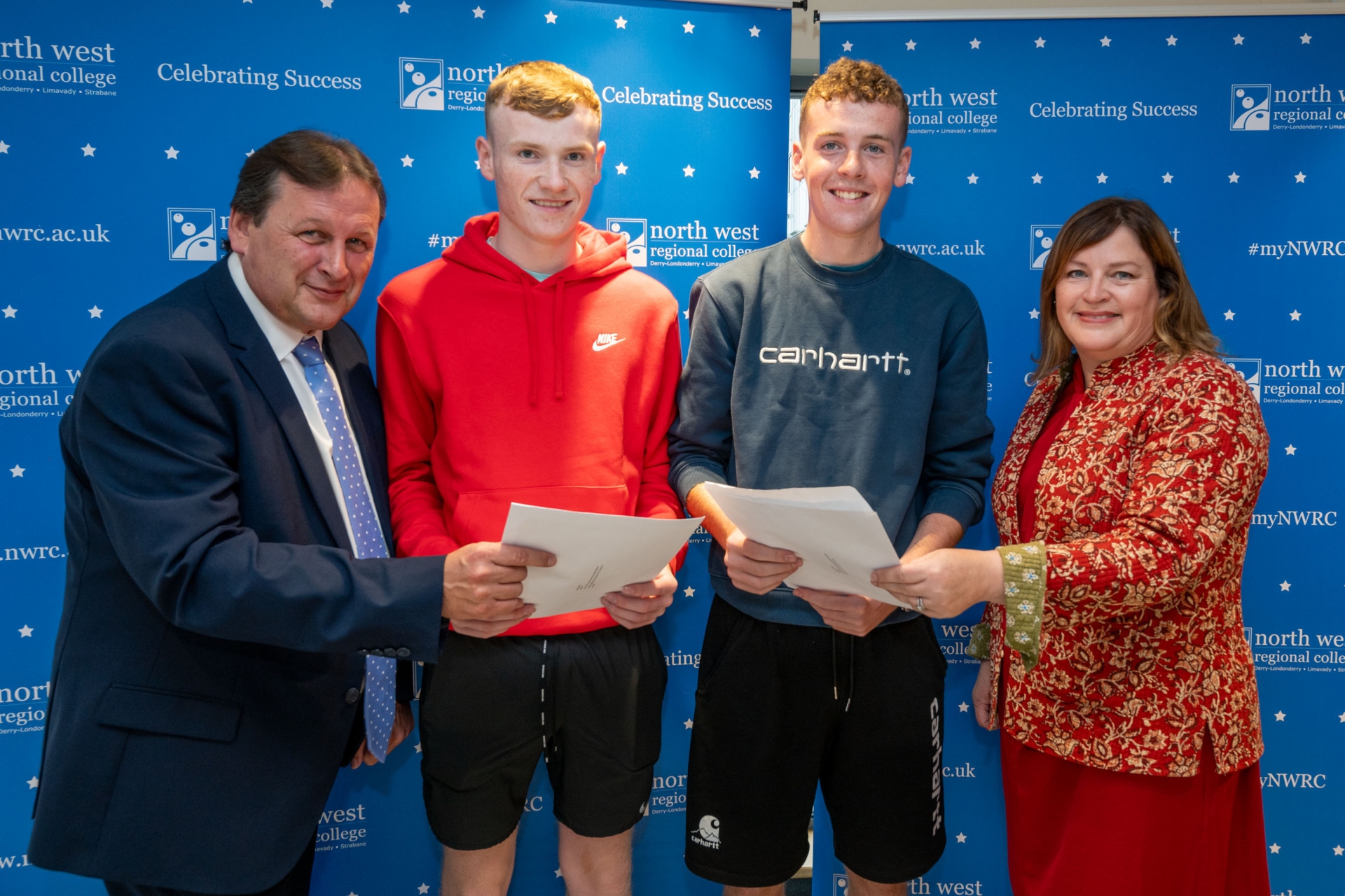 Leo Murphy, principal and chief executive of NWRC congratulates BTEC Level 3 Extended Diploma students Lucas McKinney and Gerald McCormick, with Louise Watson, Department for the Economy.