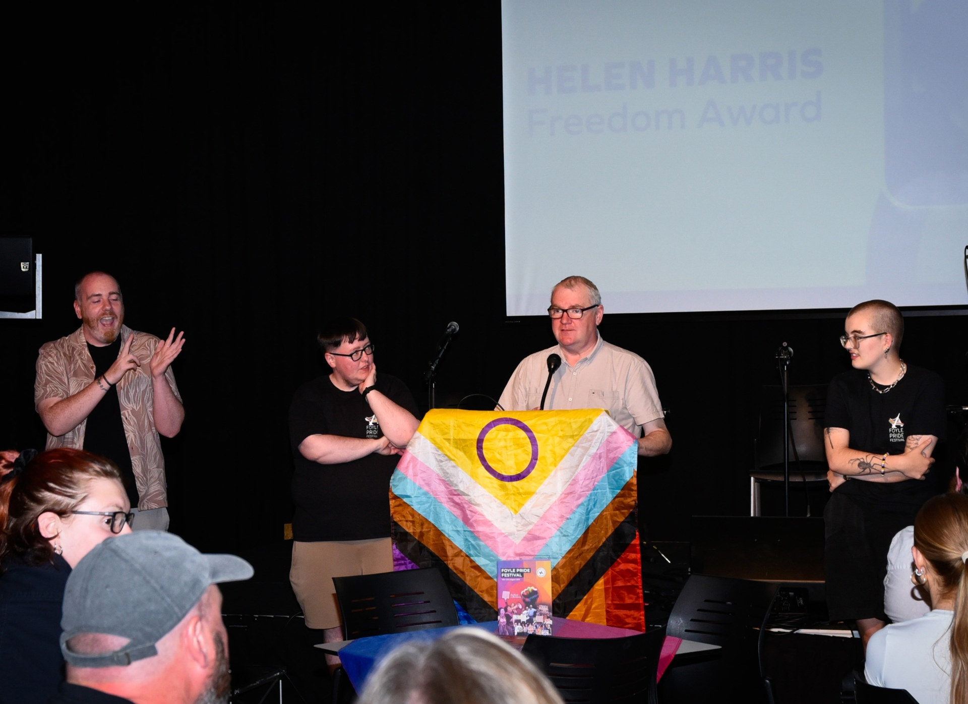 Martin McConnellogue addressing the audience at Thursday's Foyle Pride Launch and Awards Night in Culturlann Ui Chanain.