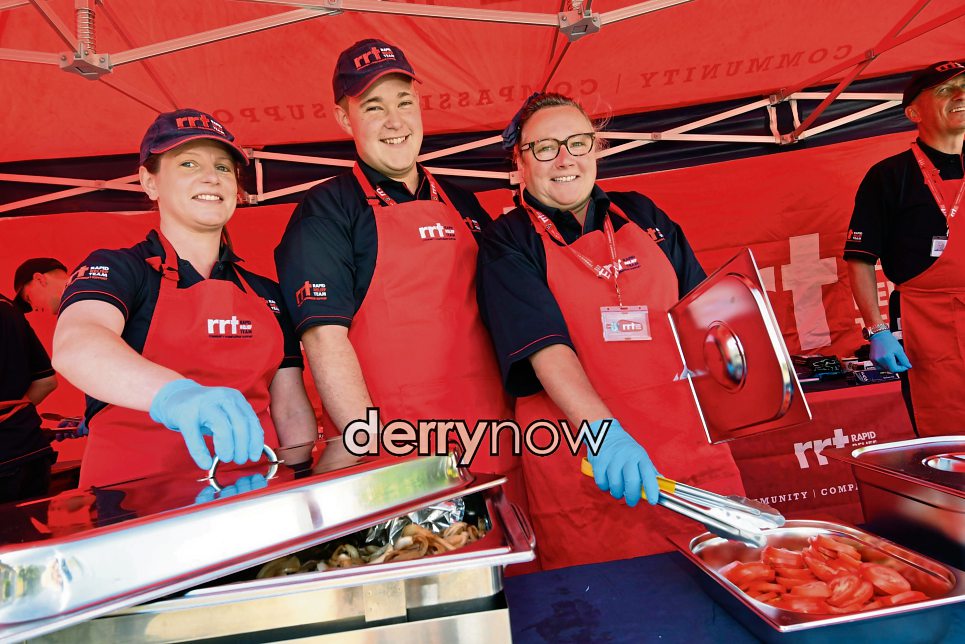 Roslyn MacCormack, Barry Glass and Lucy Barsons, from the Rapid Relief Team, hard at work preparing the food at the Feile Derry House in the Wells BBQ. (Photos: Keith Moore/nwpresspics)