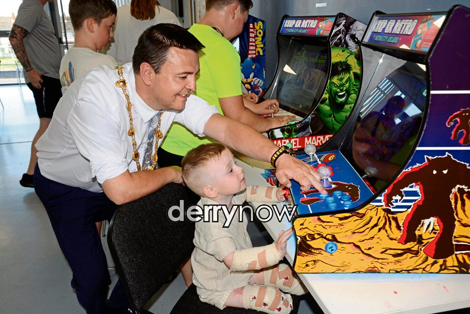 The Mayor, Councillor Ruairi McHugh helping little Daibhin McConnell-Mailey on one of the video games during the A Day for Daibhin fun day at Shantallow Community Centre.