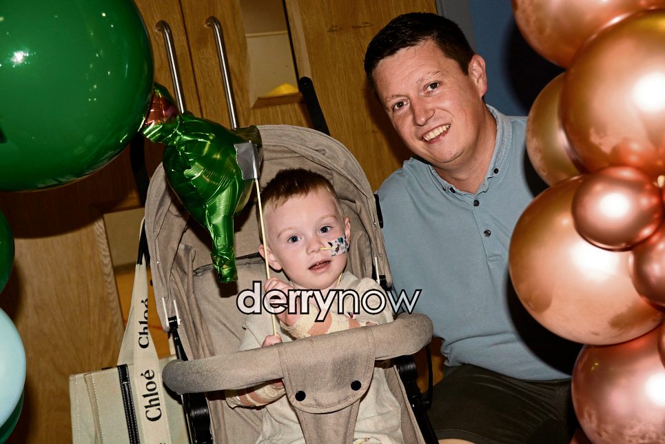 Little Daibhin McConnell-Mailey pictured with Declan Doherty who did a 10k fundraising run at the A Day for Daibhin fun day at Shantallow Community Centre.