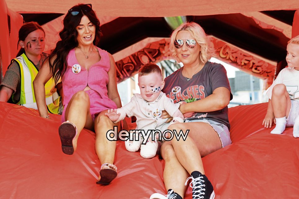 Brave little Daibhin McConnell-Mailey takes on the bouncy slide with a little help from his mum Gemma McConnell and aunt, Danielle Brown, during the A Day for Daibhin fun day at Shantallow Community Centre.