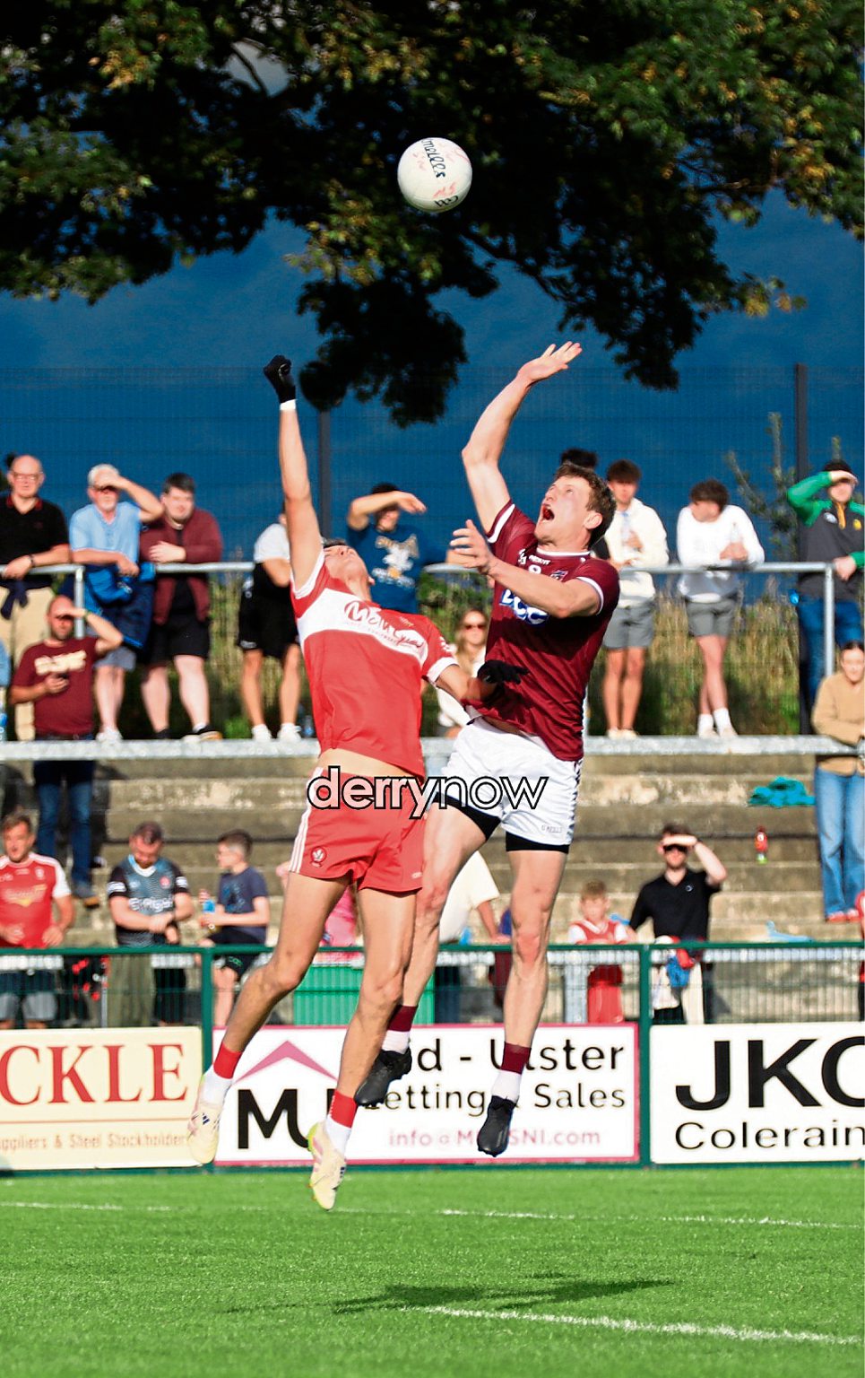 Slaughtneil Brendan Rogers and Kilrea's Tommy Rogers battle for possesion at the throw-in in the Derry SFC Round 1 game at Owenbeg on Saturday. (Photos - Tom Heaney, nwpresspics)
