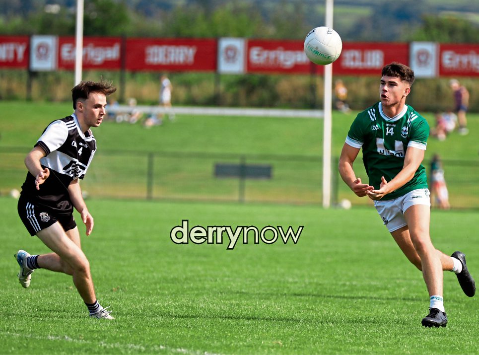 Newbridge's Callum McCrogan prepares to catch the ball as Dungiven's Niall McKeever moves.