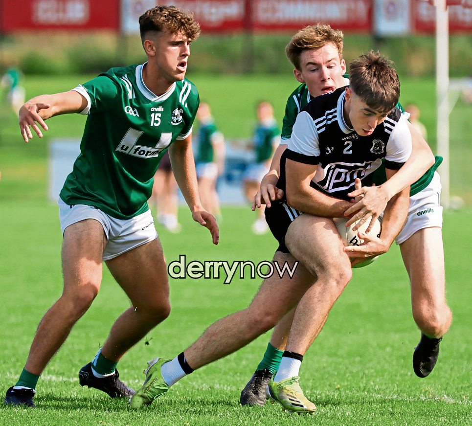 Dungiven's Shea McAteer presses forward despite the efforts of Newbridge players to stop his advance. (Photos - Tom Heaney, nwpresspics)