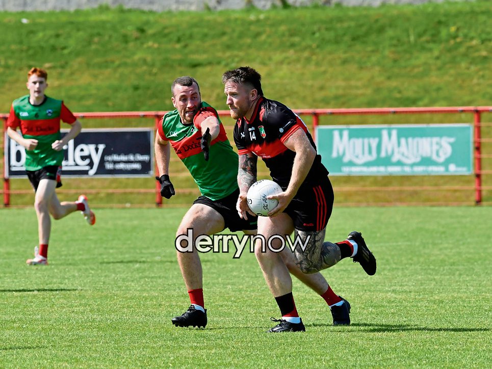 Doire Trasna’s Dylan Deery tackles Gearoid McDermott of Sean Dolans.