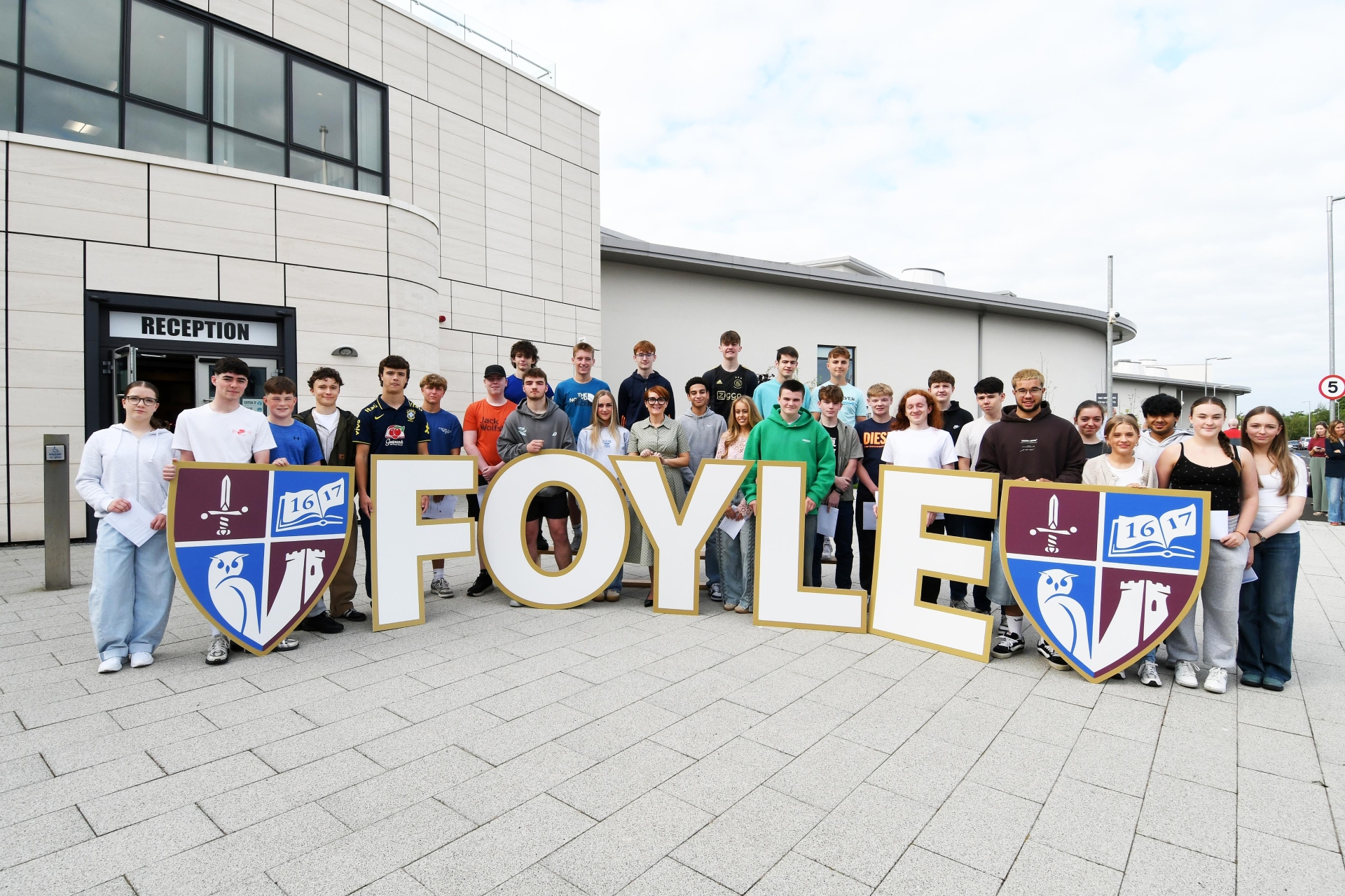 Deirdre McLaughlin, Principal, pictured with some of the students who collected their GCSE Level results at Foyle College on Thursday morning.