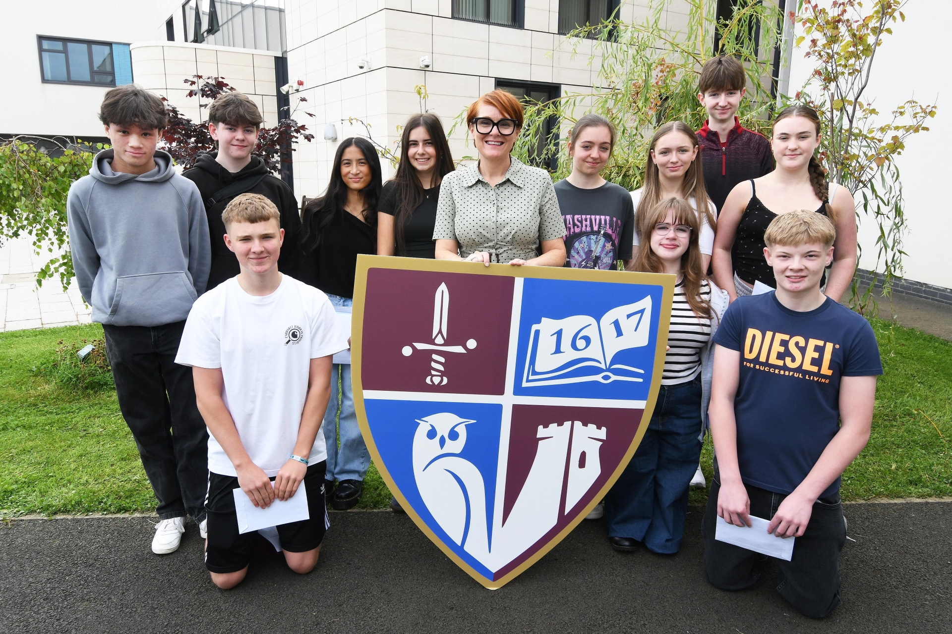 Deirdre McLaughlin, Principal, pictured with some of the students who collected their GCSE Level results at Foyle College on Thursday morning. (Photos: Keith Moore)