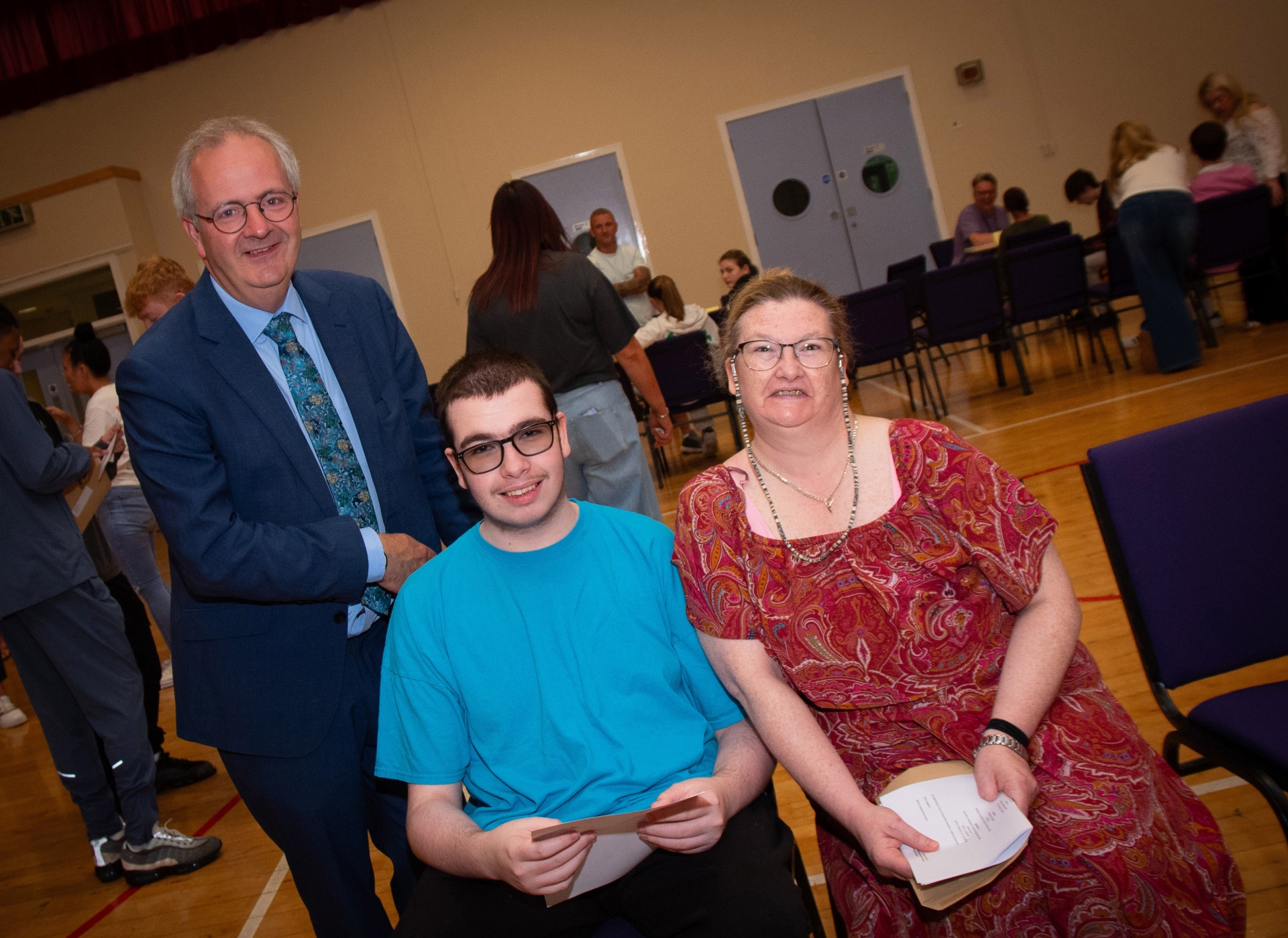 Mr. John Harkin, Principal, Oakgrove Integrated College, pictured congratulating one of his GCSE students on Thursday. (Photos: Kerrie Quinn / JimMcCaffertyPhotography)