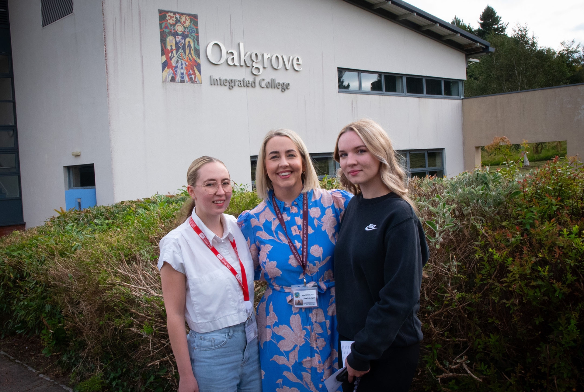 Oakgrove Integrated College Vice Principal Mrs. Kellie Marie Martin with student Madie Strawbridge-Coyle and her sister Caitlin Strawbridge on GCSE results day on Thursday. (Photos: Kerrie Quinn / JimMcCaffertyPhotography)