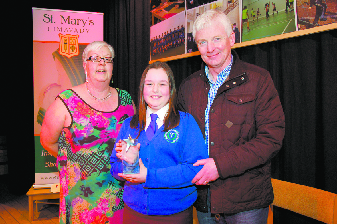 Aoife Kealey from Termoncanice PS won Best Artistic Re-creation, and is joined by Mrs. Mary McCloskey, Principal of St. Mary's Limavady and Mr. Leo McCloskey of Termoncanice PS.