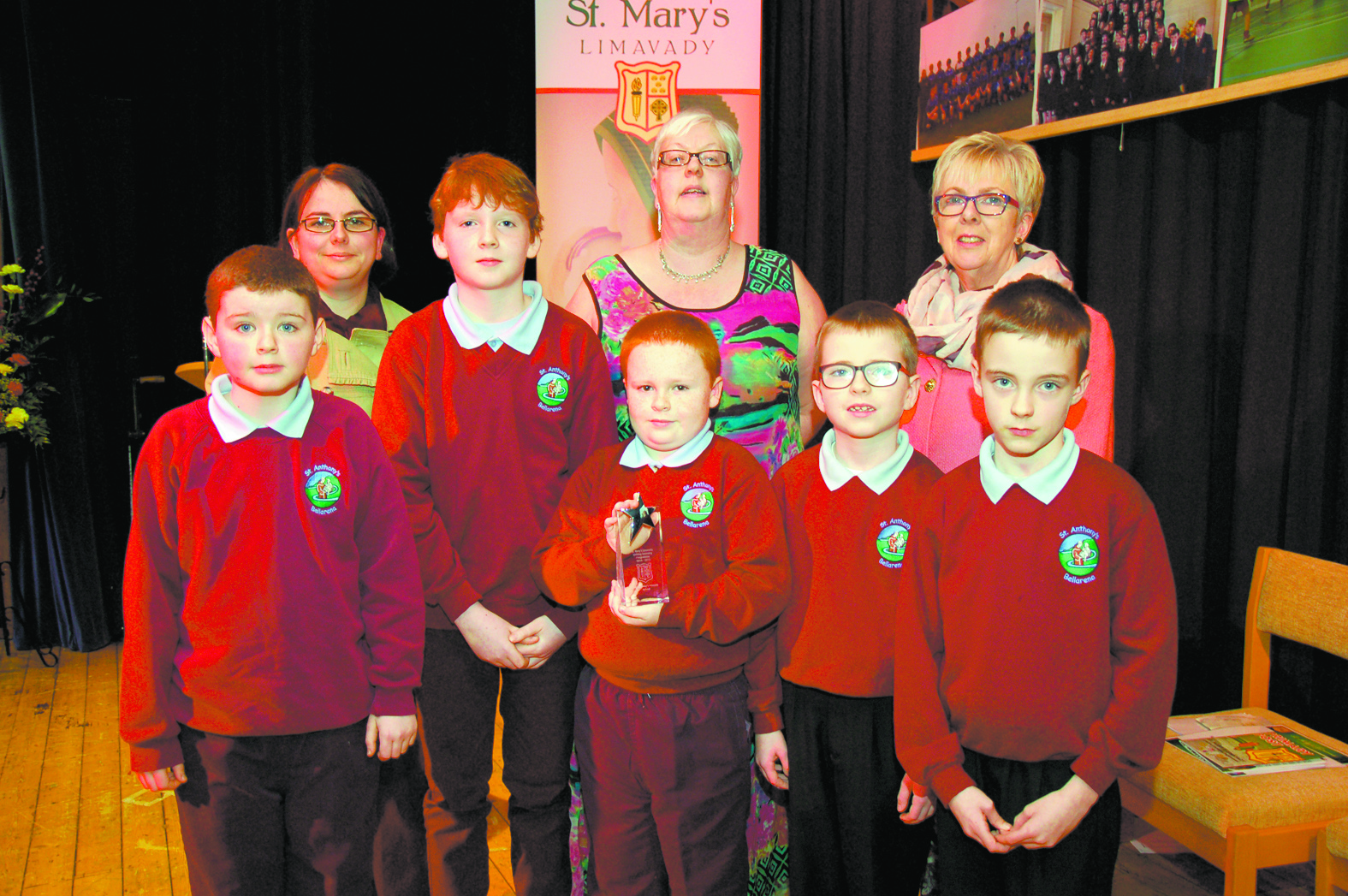 Pupils from St. Anthony's Primary School are joined by Ms. Marie Kirby and Mrs. Mary's McCloskey of St. Mary's Limavady. The students accepted the award for Best Direction in a Short Film.