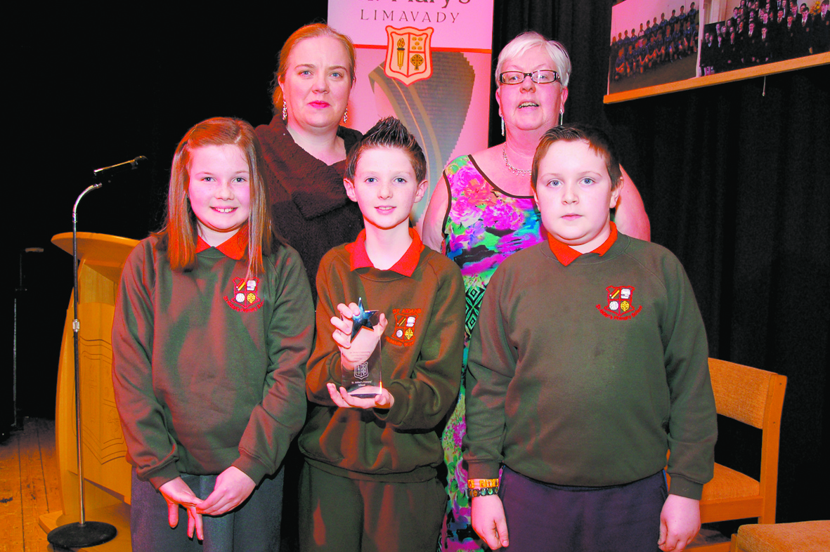 Kady Fleming, Ben Friel and Kiernan Daly from St. Aidan's PS picked up the award for Best Depiction of a Film Location. They are joined by Ms. Lisa Wilson and principal of St. Mary's Limavady, Mrs. Mary McCloskey.
