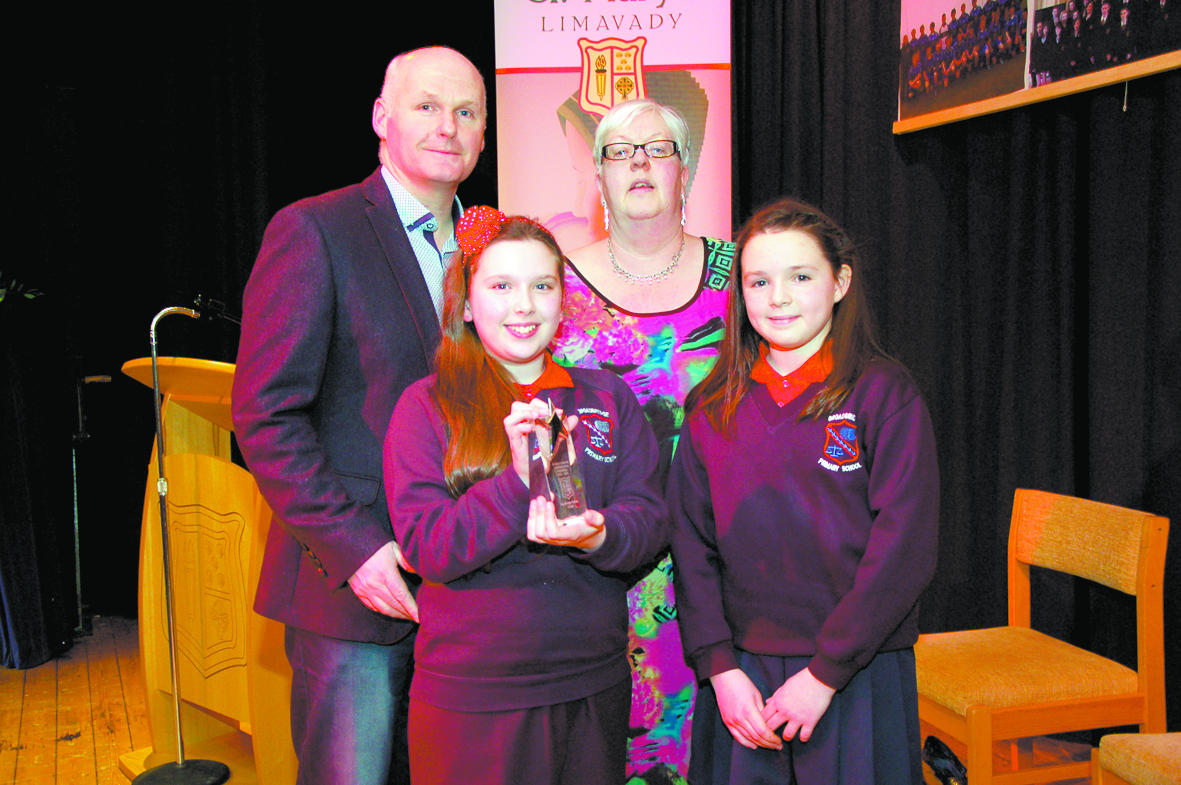 Mrs. Mary McCloskey of St. Mary's Limavady joins Mr. Dermot McCloskey with pupils from Broadbridge PS, Ciara Devlin and Devon O'Kane who picked up the award for Best Recount of a Historical Event.