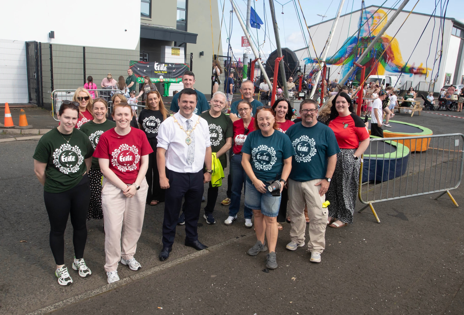 The Mayor, Ruairi McHugh pictured at the Feile 'Wan Big Party' at Fanad Drive in Creggan on Friday afternoon with Feile organisers and volunteers. (Photos: Jim McCafferty Photography)